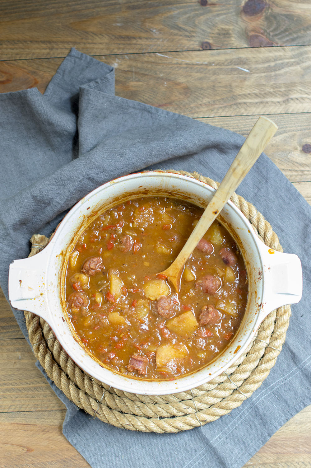 Cuando estén tiernas comprobamos como está el caldo, si está muy espeso añadimos un poco de agua más, y por en contrario está muy liquido aplasta un par de trozos de patata y mezcla para engordar la salsa.